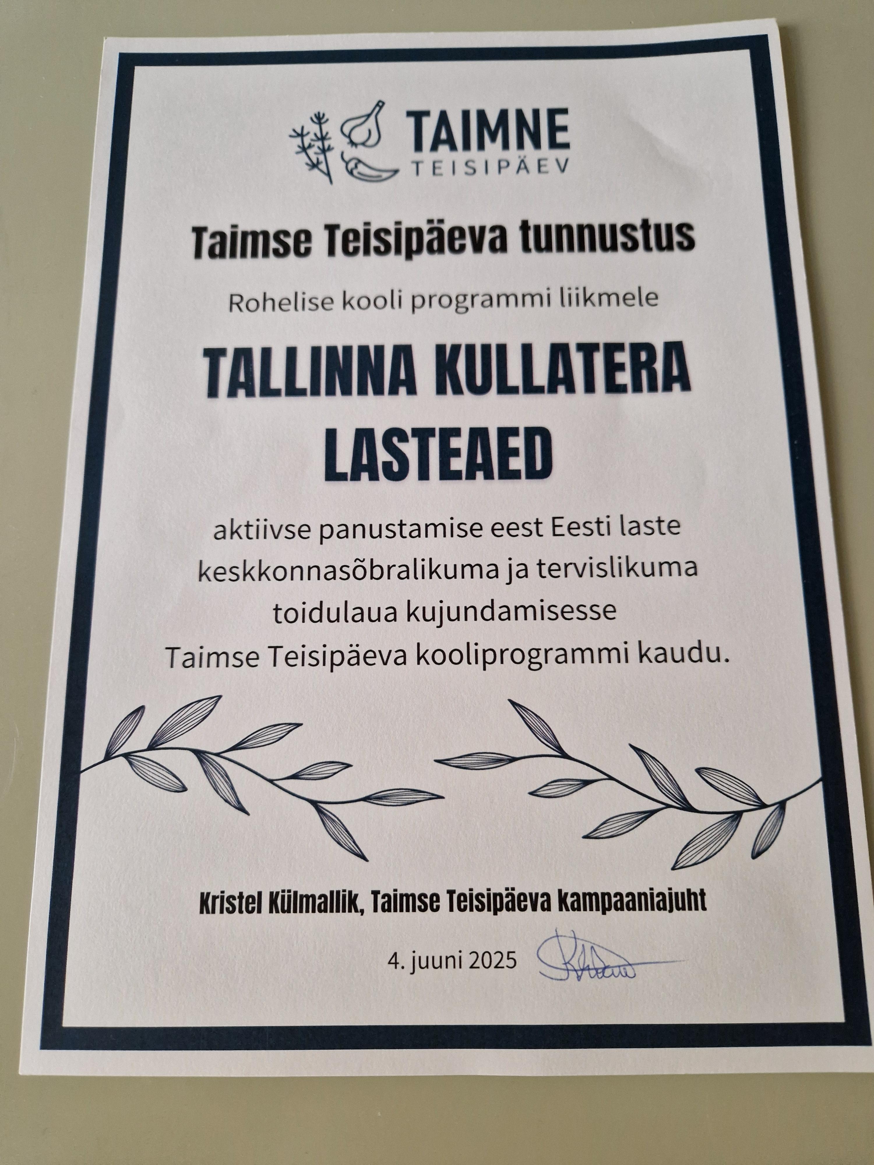 Erilise üllatusena andis Taimse Teisipäeva tunnustuse Kullaterale üle programmi kampaaniajuht Kristel Külmallik. Tunnustuse pälvisime järjepideva aktiivse panustamise eest laste keskkonnasõbralikuma ja tervislikuma toidulaua kujundamisel kooliprogrammi Taimne Teisipäeva kaudu.