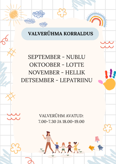 25 august 2025 Valverühma korraldus Sügisperioodil avaneb Liivaku lasteaias jälle valverühm. Valverühm on avatud hommikul 7.00-7.30 ja õhtul 18.00-19.00. Valverühm on iga kuu erinev. Jaga sotsiaalmeedias FacebookTwitter