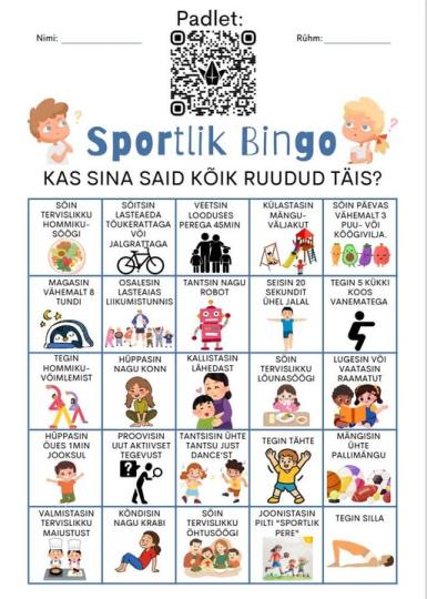 Lastele ja peredele mõtles liikumisõpetaja Artur välja toreda liikumisbingo, kus koos tuli teha erinevaid harjutusi ja liikumistegevusi. Neid sai piltide kaasabil jagada ka teistega, et oleks näha erinevad tegevused. Lepatriinu ja Päikese rühm käisid pargibingo mängu mängimas Kivila pargis, Siilikeserühm käis Kihnu lasteaia ölümpiamängudel ja lasteaia personal jalutas Pirita terviserajal.