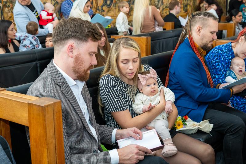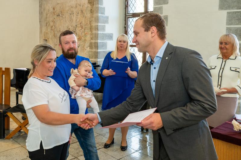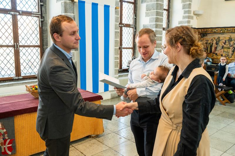 Tallinna Raekojas anti täna 53 vastsündinu vanematele pidulikult üle linna vapiga kaante vahel nimetunnistused.